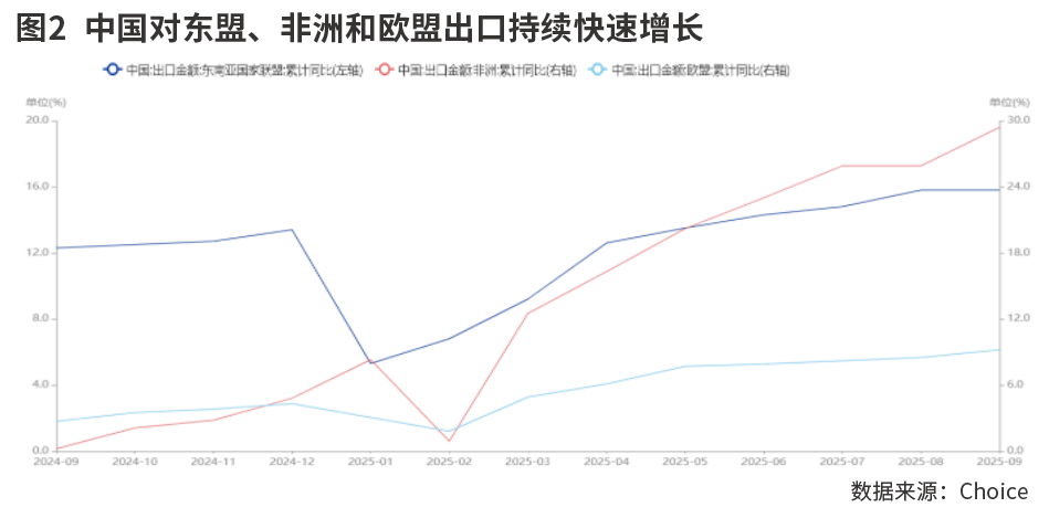 前三季度,在关税冲击的影响下,中国对美国出口增速同比下滑16.2%。但好的产品你美国不要,自然会有其他人买,中国出口的产品在其他国家和地区遍地开花。前三季度,对东盟出口同比增速为15.8%,比2024年同期提升3.5个百分点;对非洲出口同比大幅增长29.4%,比2024年同期提升29.2个百分点;对欧盟出口同比增长9.2%,比2024年同期提升6.5个百分点。